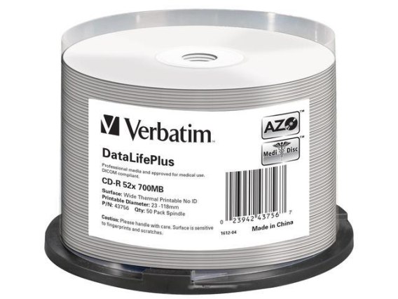 Informacje dodatkowe: CDR VERBATIM 700MB DL+ AZO THERMAL PRINTABLE MEDI DISC (CAKE 50) NO ID, DataLifePlus, Profesjonalne optyczne nośniki danych są wykonane ze specyfikacji jeszcze, bardziej rygorystycznych niż przewidziane przez aktualne standardy. Wyższe, specyfikacje zapewniają większą kompatybilność z nagrywarkami, i odtwarzaczami. Pozwala to zapewnić wyższą jakość nagrywania i dłuższy, okres przechowywania plików, a także wyższą niezawodność. Profesjonalne, nośniki optyczne marki Verbatim można rozpoznać po oznaczeniu DataLifePlus., Technologia AZO, Technologia AZO zapewnia najwyższą odporność na promieniowanie UV,, zwiększając poziom ochrony i niezawodności. Dzięki niej okres bezpiecznej, archiwizacji wysokiej jakości zdjęć i dźwięku przekracza 100 lat., Drukowanie termiczne, Płyty termiczne Verbatim umożliwiają nagrywanie zdjęć w wysokiej, rozdzielczości oraz wyraźnych tekstów na całej powierzchni za pomocą, drukarki termicznej. Szybkoschnąca powierzchnia zapewnia trwałość nadruków., Płyty termiczne są zgodne z drukarkami termicznymi z serii TEAC P55B & C,, Rimage Everest 400 & 600 i Rimage Prism Plus., Pojemność: 700MB, Prędkość: 52x, Opakowanie: 50 Pack Spindle, Powierzchnia: Wide Thermal Printable - Non ID Branded, Obszar zapisywania: 23 - 118mm